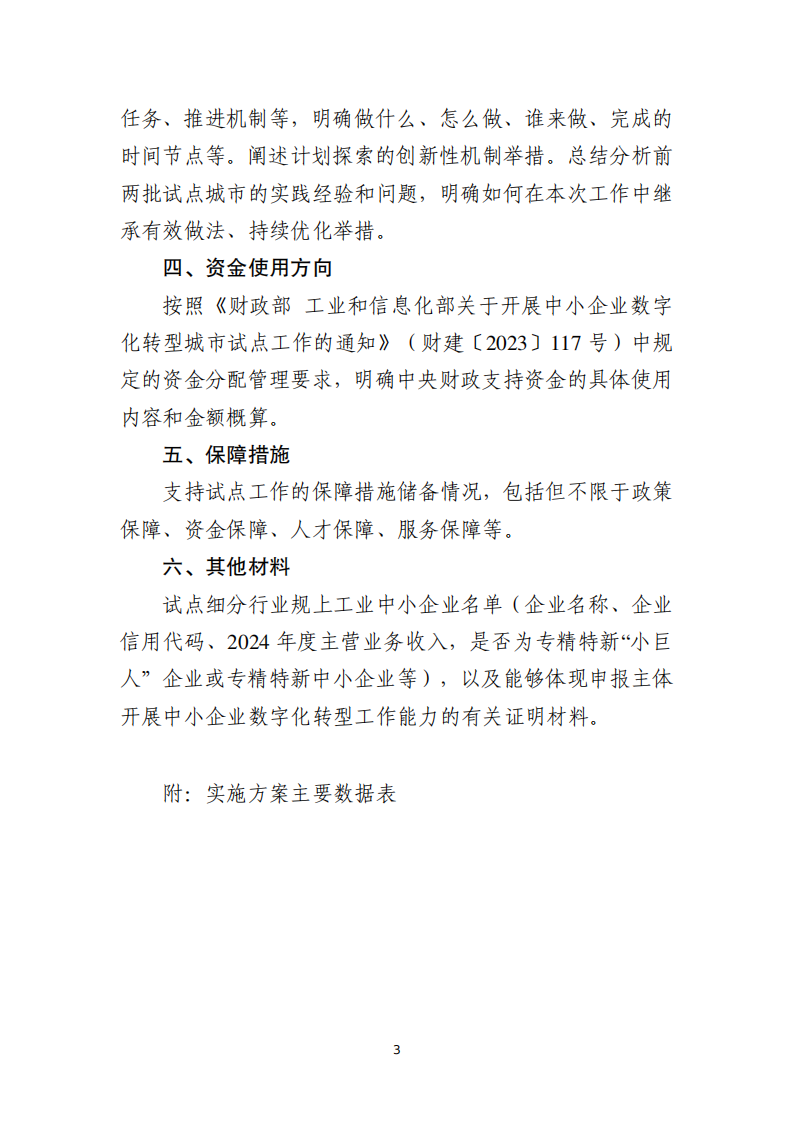 ? ? ? ? ?為深入貫徹落實(shí)黨中央、國務(wù)院決策部署,加大對中小企業(yè)數(shù)字化轉(zhuǎn)型的支持,根據(jù)《財(cái)政部?工業(yè)和信息化部關(guān)于開展中小企業(yè)數(shù)字化轉(zhuǎn)型城市試點(diǎn)工作的通知》(財(cái)建〔2023〕117號,以下簡稱《通知》)要求,現(xiàn)就2025年中小企業(yè)數(shù)字化轉(zhuǎn)型城市試點(diǎn)申報(bào)工作有關(guān)事項(xiàng)通知如下: