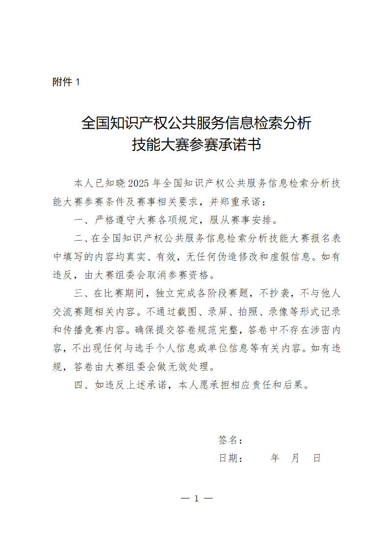 附件:1.全國知識產權公共服務信息檢索分析技能大賽參賽承諾書