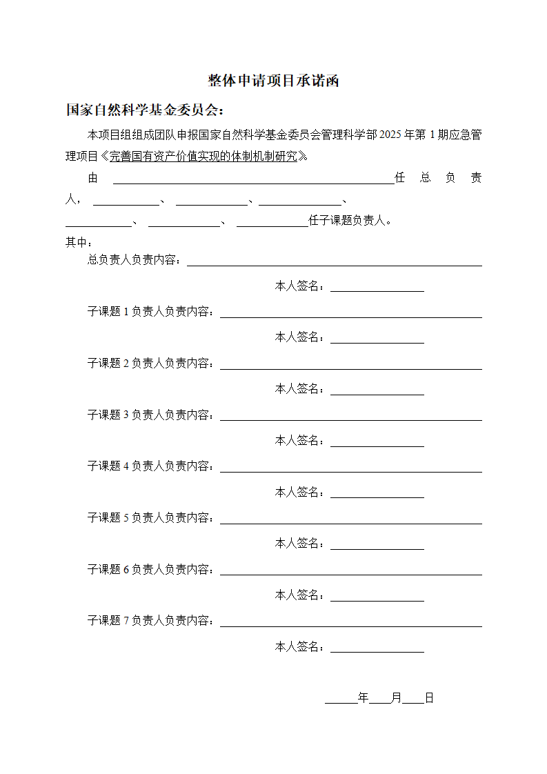 2.?鼓勵并優(yōu)先資助團隊整體申請本項目。要求申請人將本項目作為一個整體來申請,其中包含1個總課題和7個子課題,并分別提交項目總體申請書和各子課題申請書,在研究內容中應明確說明本課題與其它相關課題之間的關系,加強各課題之間的合作。總項目負責人需在申請書中介紹子課題分工情況,并附上“整體申請項目承諾函”(附件),子課題無需提供承諾函。對不能組織團隊整體申請,但對某一子課題確有研究優(yōu)勢的單份申請也有可能獲得資助,該申請獲準立項后申請人將歸入整個項目團隊。