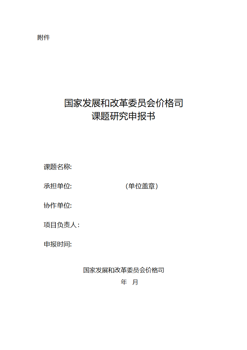(二)認真填寫《國家發展和改革委員會價格司課題研究申報書》(附后)。申報書紙質件一式3份并加蓋牽頭申報人所在單位公章,電子版刻盤,通過中國郵政EMS寄送至國家發展改革委價格司(詳細地址:北京市西城區月壇南街38號價格司,郵政編碼:100824),信封上請注明“申報XXX課題研究項目”字樣。