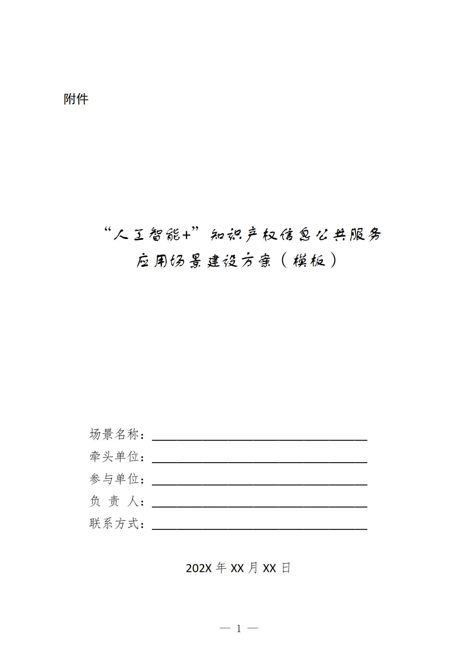 請各省級知識產權局結合工作實際,遵循自愿原則,將成熟的或有意愿培育的“人工智能+”知識產權信息公共服務應用場景建設方案(模板參見附件),于2025年8月16日前報送我局公共服務司。