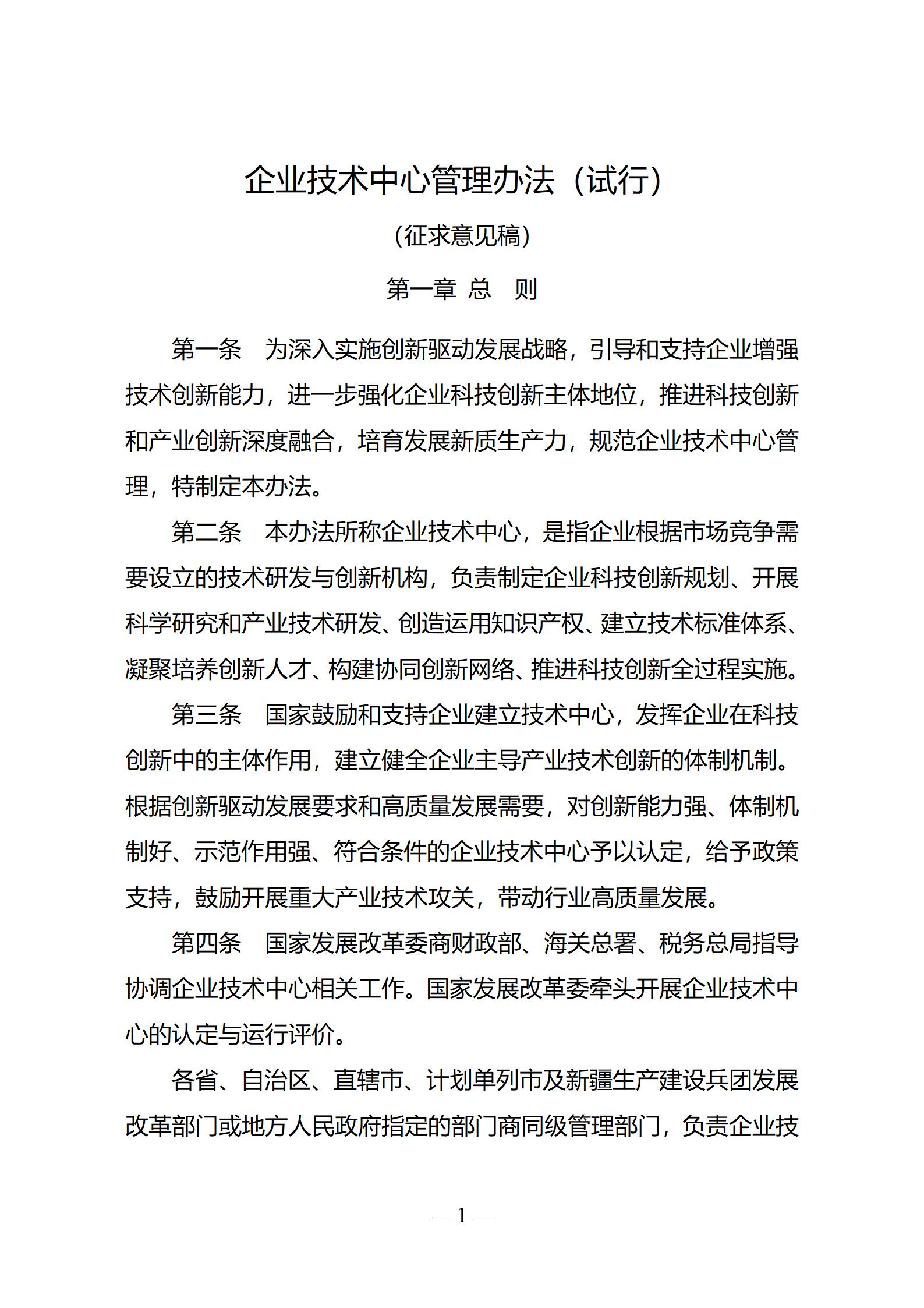為深入實施創(chuàng)新驅(qū)動發(fā)展戰(zhàn)略,引導(dǎo)和支持企業(yè)增強技術(shù)創(chuàng)新能力,進(jìn)一步強化企業(yè)科技創(chuàng)新主體地位,推進(jìn)科技創(chuàng)新和產(chǎn)業(yè)創(chuàng)新深度融合,培育發(fā)展新質(zhì)生產(chǎn)力,加強和優(yōu)化企業(yè)技術(shù)中心管理,我們起草了《企業(yè)技術(shù)中心管理辦法(征求意見稿)》,現(xiàn)向社會公開征求意見。