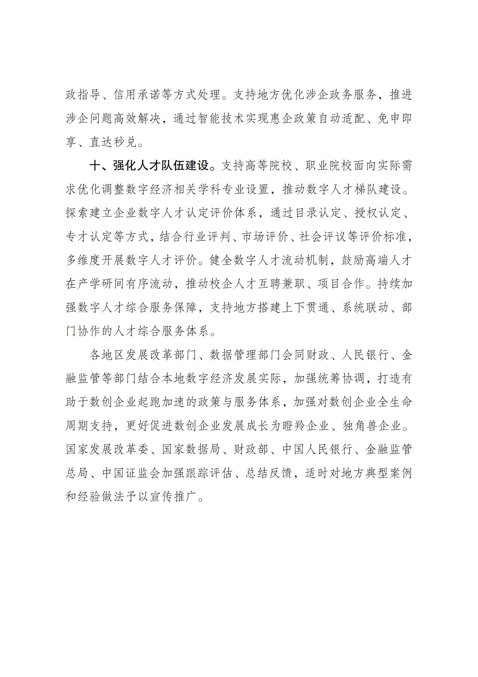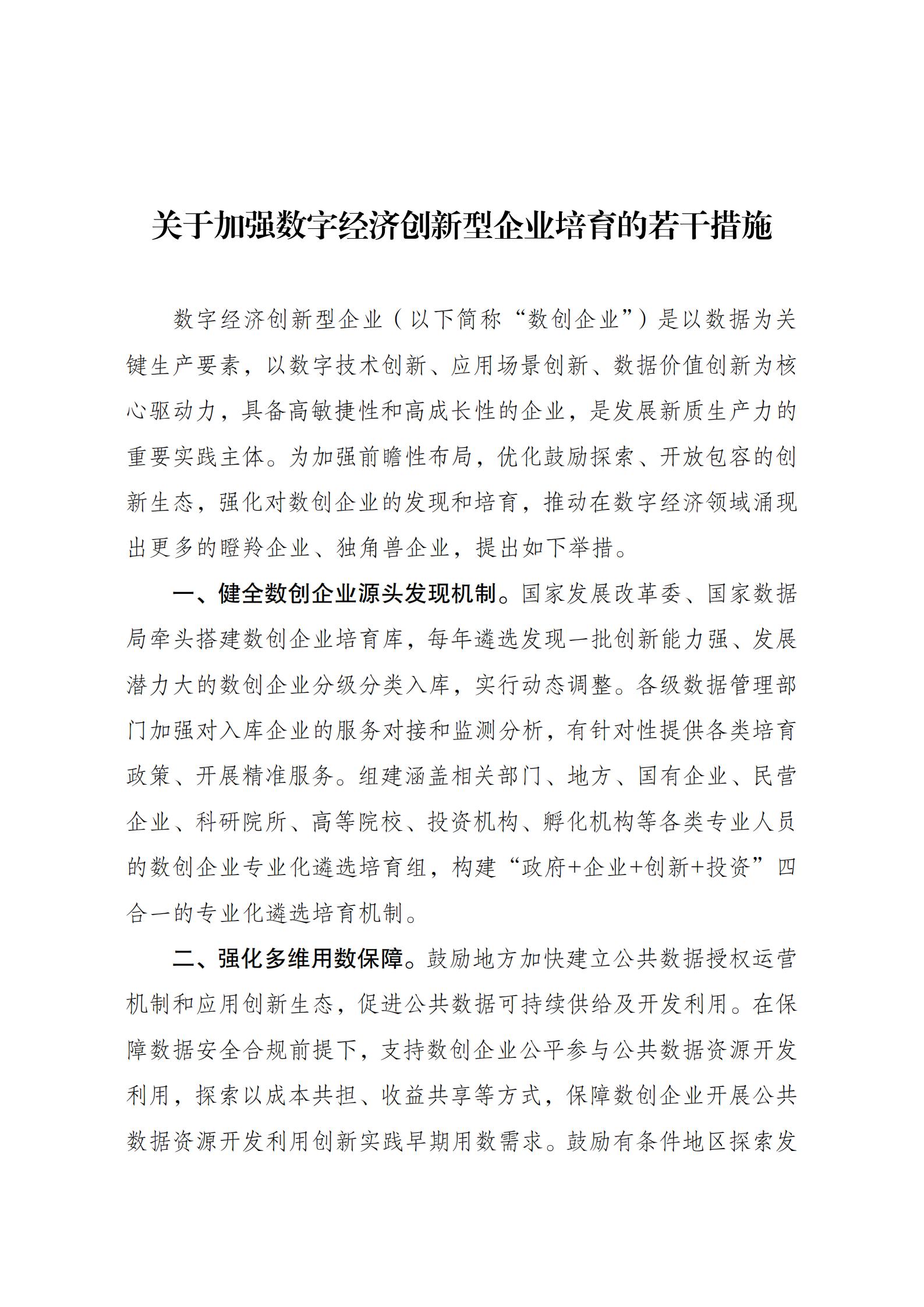 ??為加快培育數(shù)字經(jīng)濟(jì)創(chuàng)新型企業(yè),讓更多企業(yè)在數(shù)字經(jīng)濟(jì)新領(lǐng)域新賽道跑出加速度,推動(dòng)涌現(xiàn)更多瞪羚企業(yè)、獨(dú)角獸企業(yè),國(guó)家發(fā)展改革委、國(guó)家數(shù)據(jù)局、財(cái)政部、中國(guó)人民銀行、金融監(jiān)管總局、中國(guó)證監(jiān)會(huì)組織制定了《關(guān)于加強(qiáng)數(shù)字經(jīng)濟(jì)創(chuàng)新型企業(yè)培育的若干措施》?,F(xiàn)印發(fā)給你們,請(qǐng)遵照?qǐng)?zhí)行。