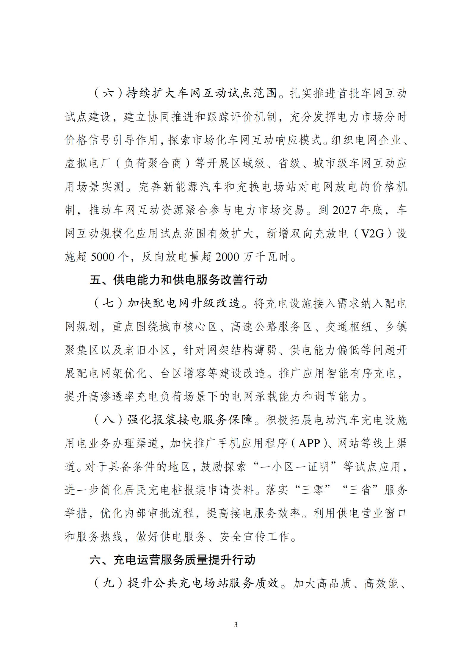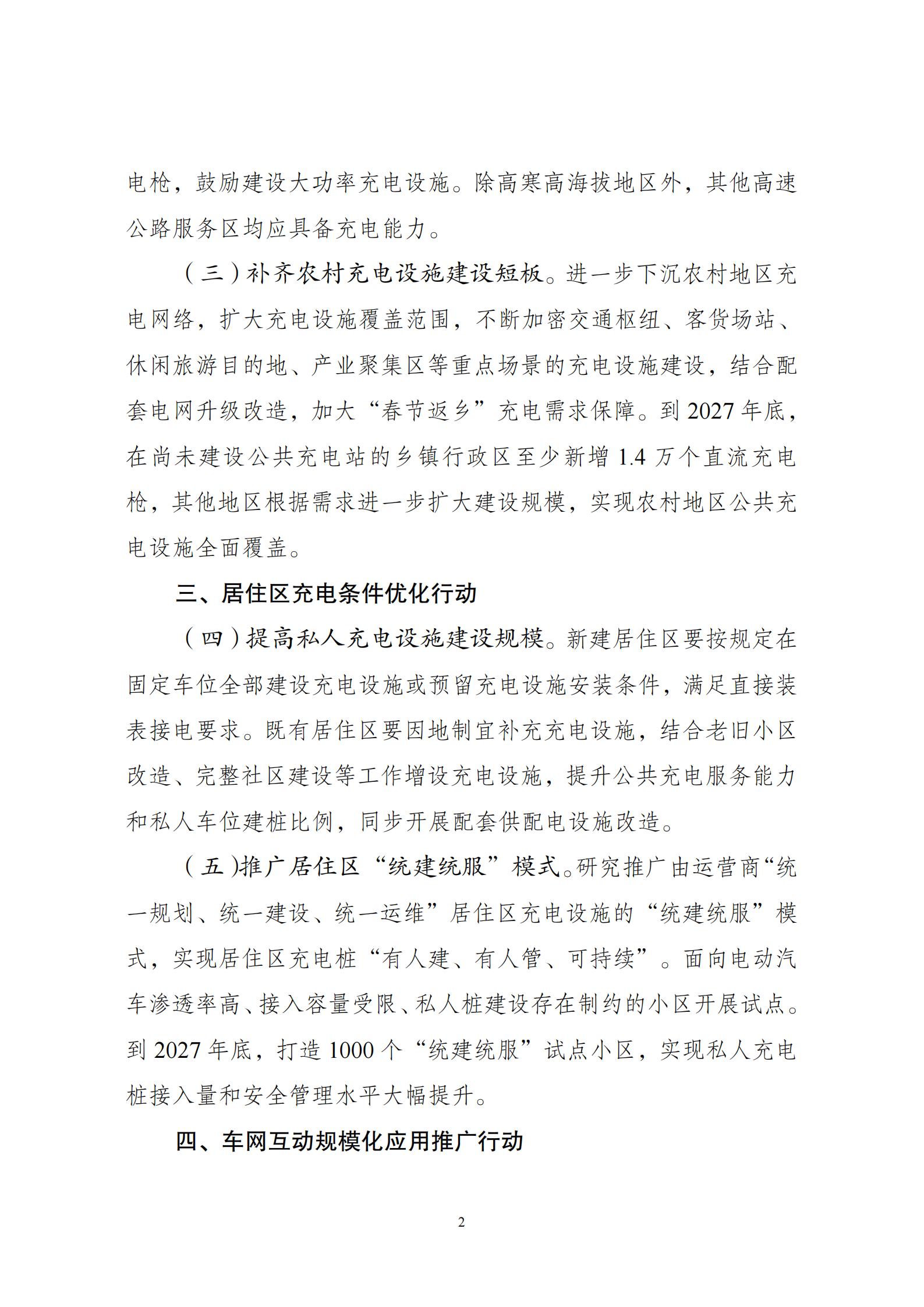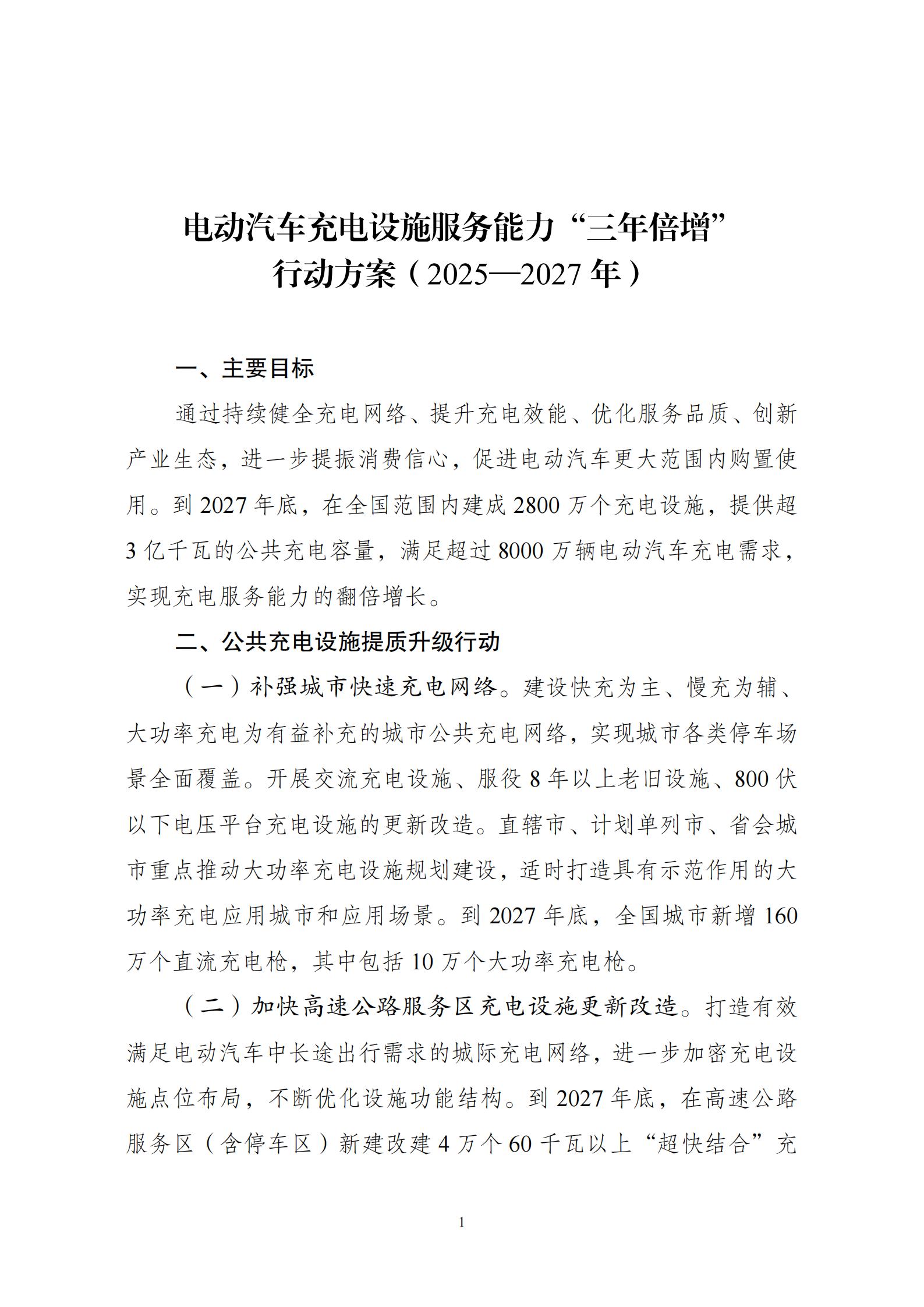 ??為落實《提振消費專項行動方案》有關要求,加大力度完善電動汽車充電設施服務網絡,提升消費品質,促進電動汽車更大范圍內購置使用,國家發展改革委等部門研究制定了《電動汽車充電設施服務能力“三年倍增”行動方案(2025—2027年)》,現印發給你們,請認真組織落實。