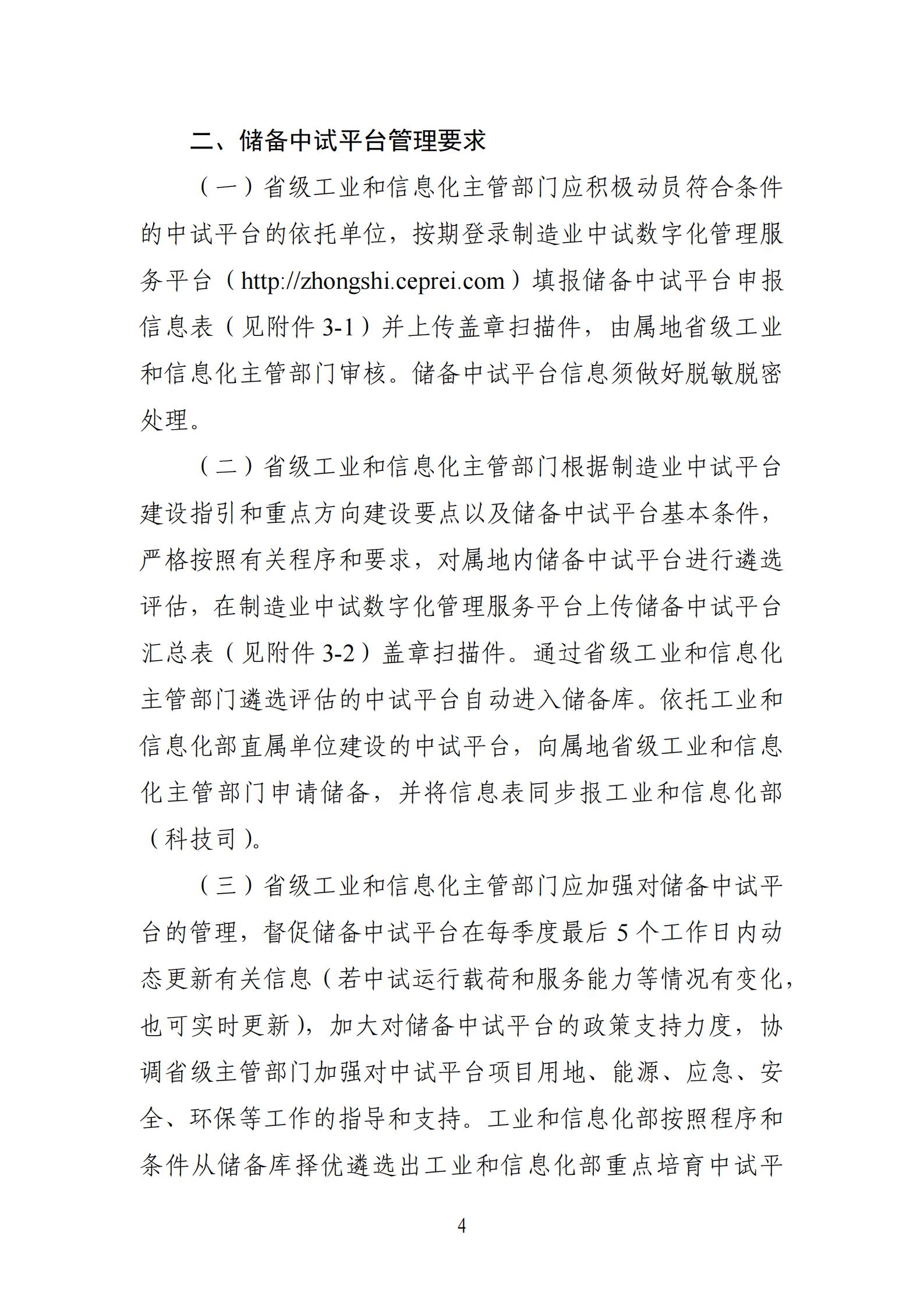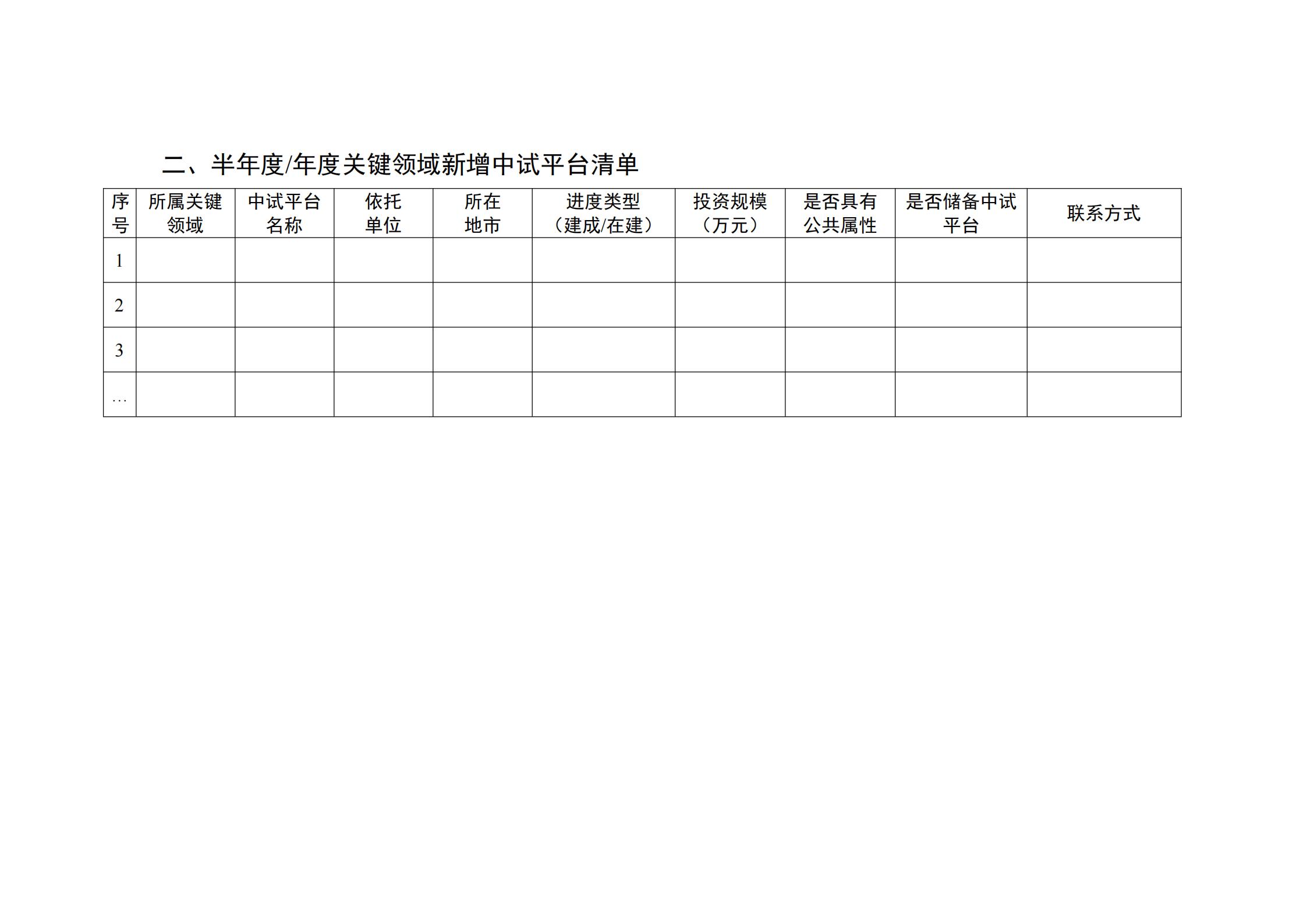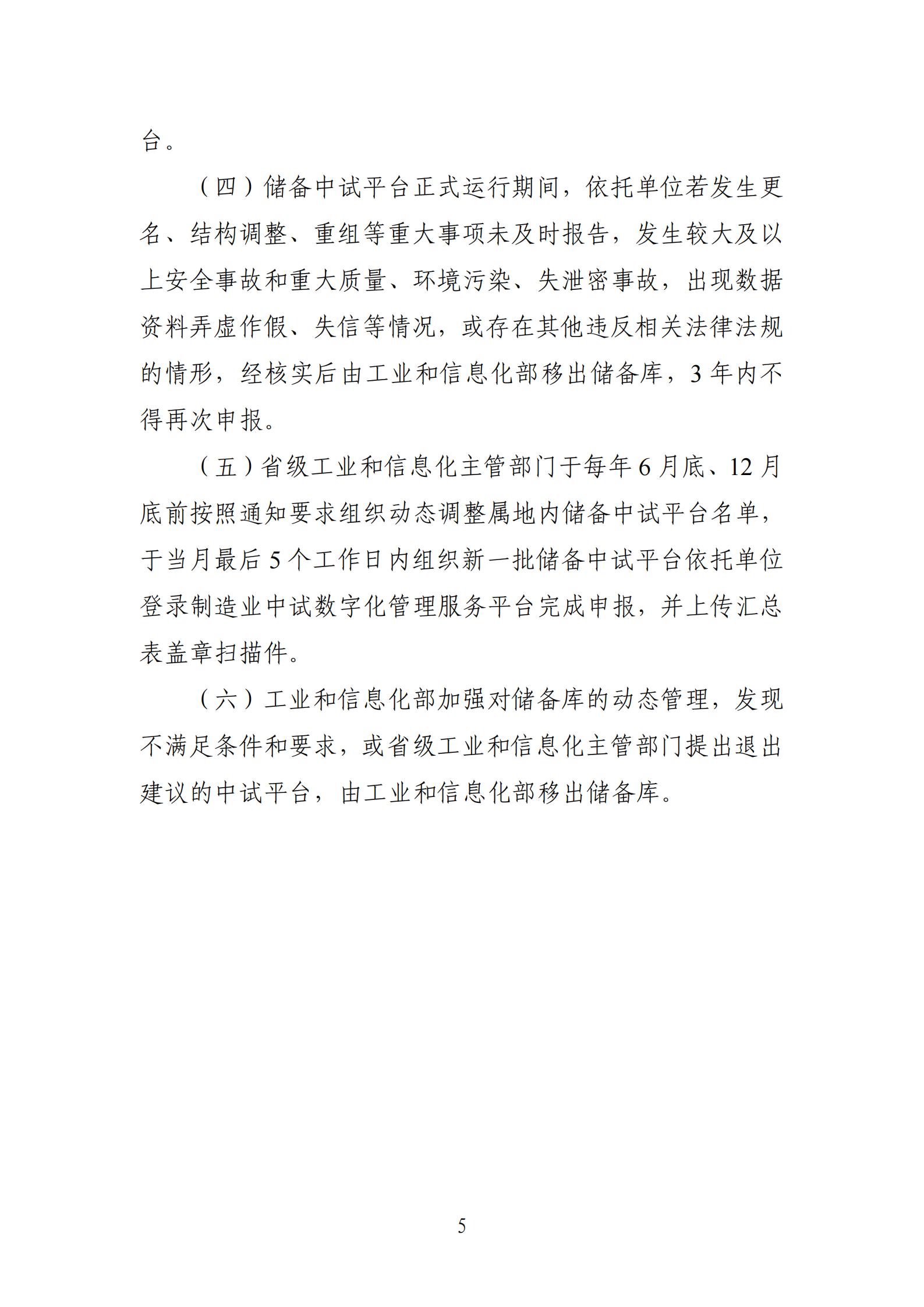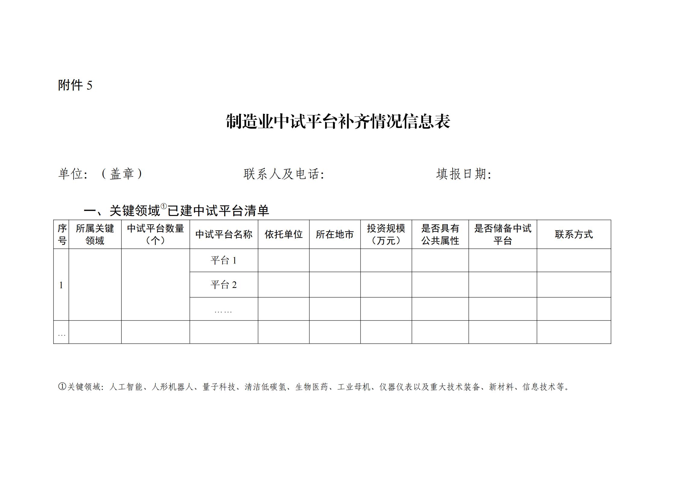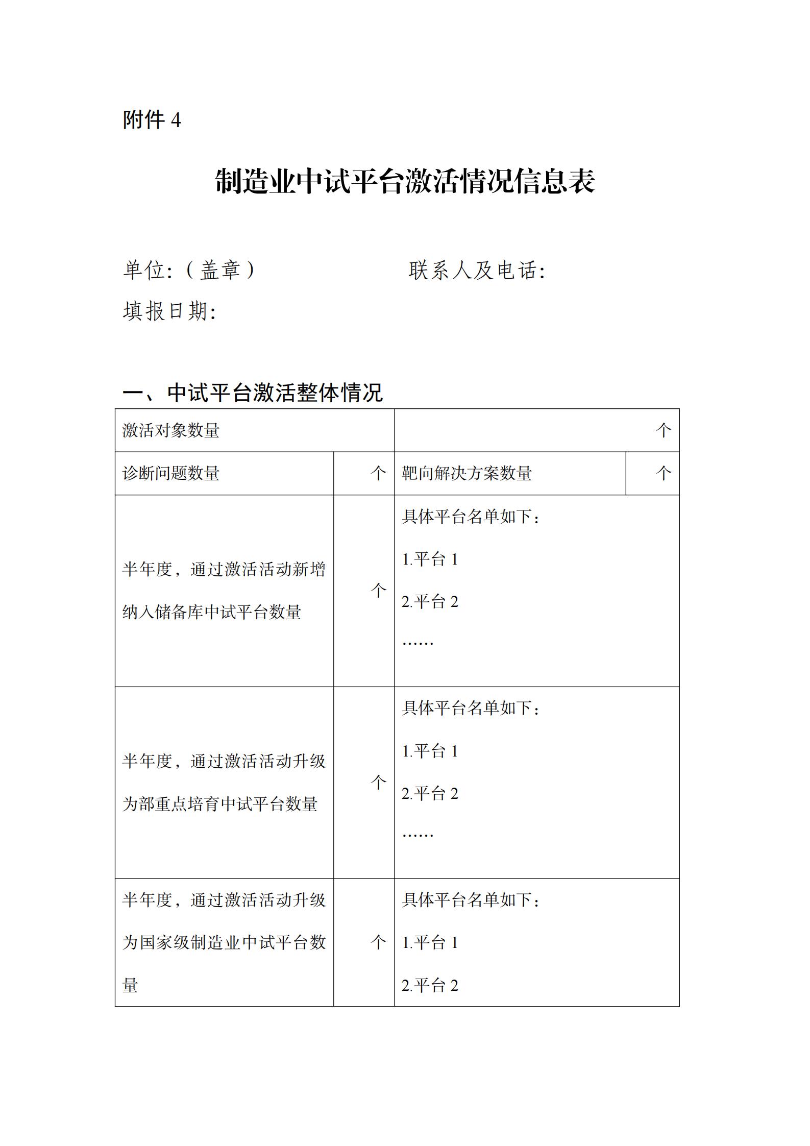 (二)各地工業和信息化主管部門于每年6月、12月最后5個工作日內將屬地內儲備中試平臺名單動態調整情況、制造業中試平臺激活情況信息表(附件4)和補齊情況信息表(附件5),在制造業中試數字化管理服務平臺填報并上傳蓋章掃描件。