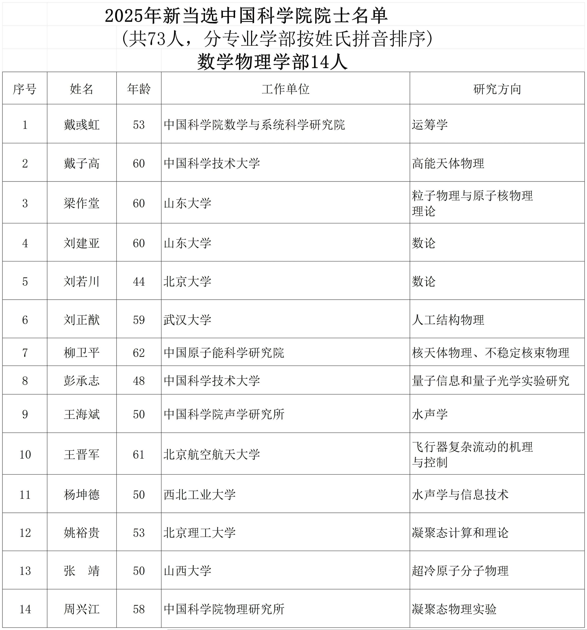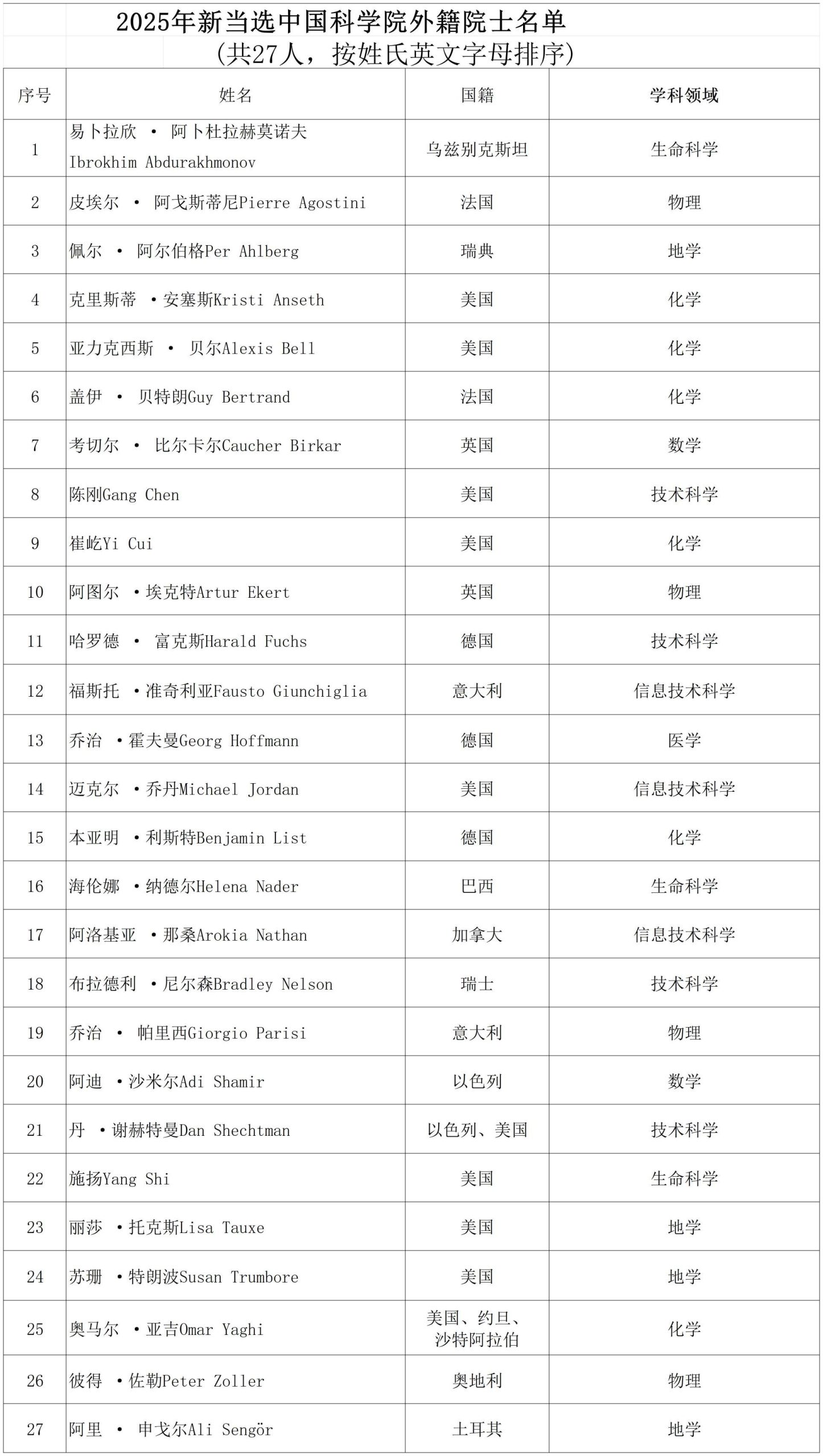 根據《中國科學院院士章程》《中國科學院院士增選工作實施辦法(試行)》《中國科學院外籍院士選舉辦法》等規定,2025年中國科學院選舉產生了73名中國科學院院士和27名中國科學院外籍院士。