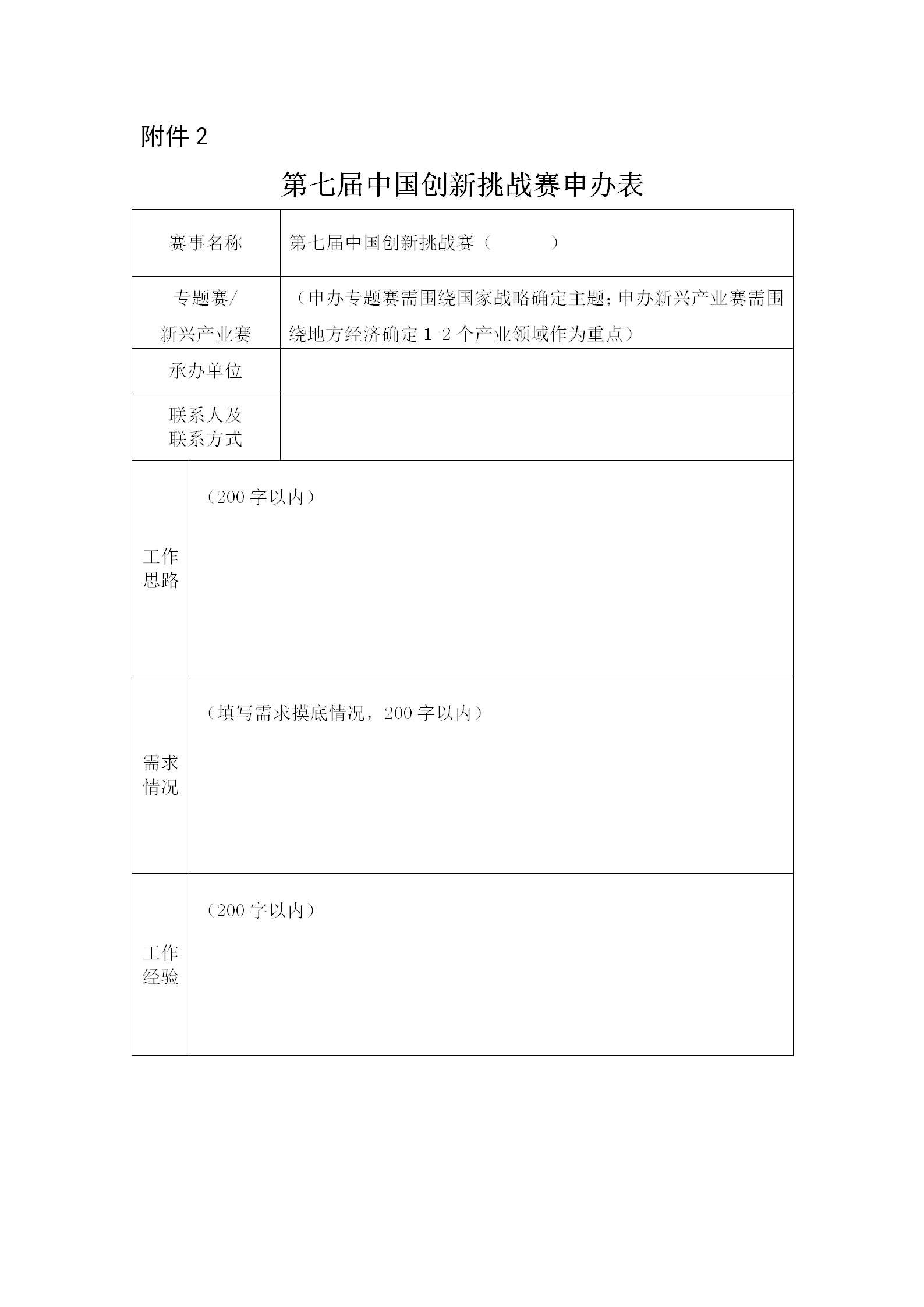 ??? 1.各省級科技主管部門組織轄區內各市級科技主管部門、國家高新區管委會等,根據本通知及《第七屆中國創新挑戰賽工作方案》(附件1),結合本地區實際情況,遴選有條件的地方(省、區、市或國家高新區)作為具體承辦地,填寫《第七屆中國創新挑戰賽申辦表》(附件2)。