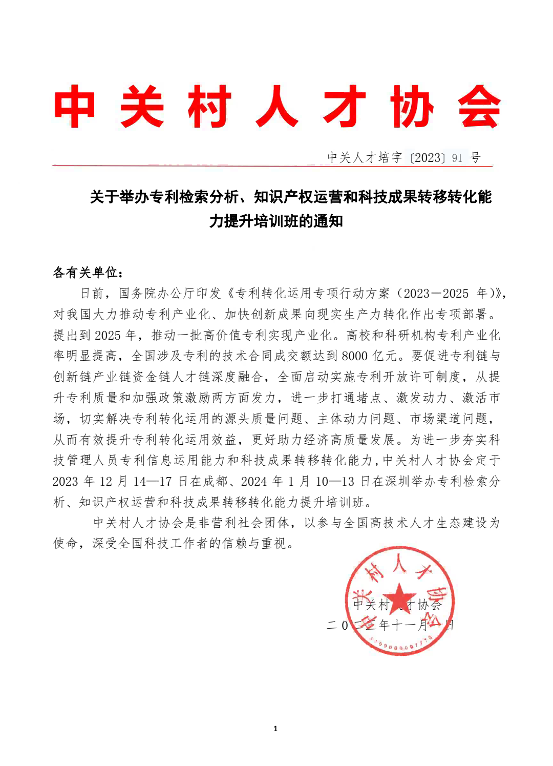專(zhuān)利檢索分析、知識(shí)產(chǎn)權(quán)運(yùn)營(yíng)和科技成果轉(zhuǎn)移轉(zhuǎn)化能力提升培訓(xùn)班(12月成都1月深圳)