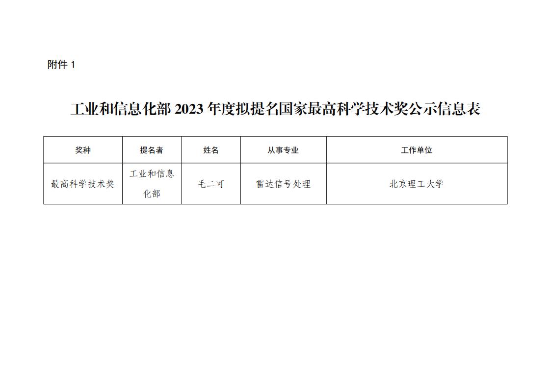 附件:1.工業(yè)和信息化部2023年度擬提名國(guó)家最高科學(xué)技術(shù)獎(jiǎng)公示信息表