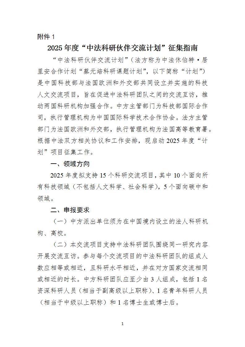 附件:1.2025年度“中法科研伙伴交流計(jì)劃”征集指南