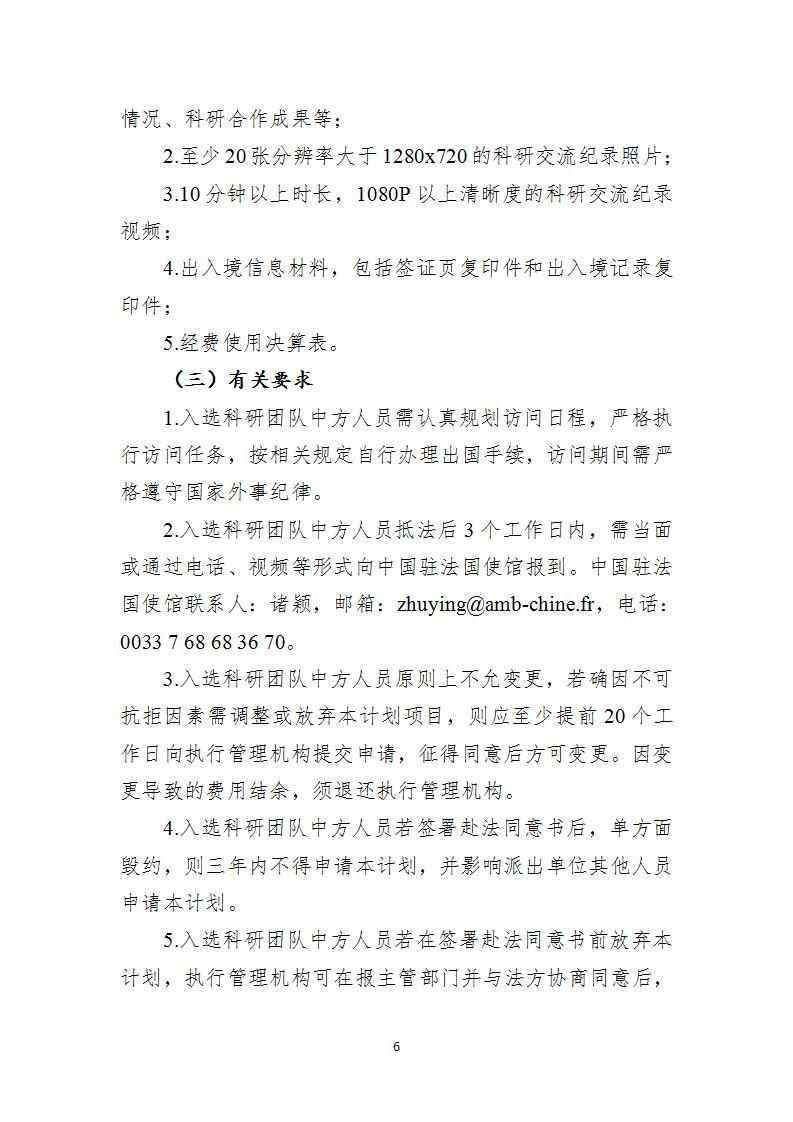 在2025年度“計(jì)劃”框架下,雙方擬聯(lián)合資助15個(gè)科研交流項(xiàng)目,其中10個(gè)面向所有科技領(lǐng)域(不包括人文科學(xué)、社會(huì)科學(xué)),5個(gè)面向碳中和領(lǐng)域。每個(gè)項(xiàng)目由中法科研團(tuán)隊(duì)聯(lián)合申報(bào),并根據(jù)對(duì)等原則開(kāi)展交流互訪(有關(guān)要求詳見(jiàn)附件1“征集指南”)。中方主管部門(mén)將為入選的中方科研團(tuán)隊(duì)赴法開(kāi)展科研交流活動(dòng)提供每個(gè)項(xiàng)目共15萬(wàn)元的資助,項(xiàng)目執(zhí)行期為2年(2025年1月1日至2026年12月31日)。法方主管部門(mén)將為法方科研團(tuán)隊(duì)來(lái)華交流提供相應(yīng)資助。