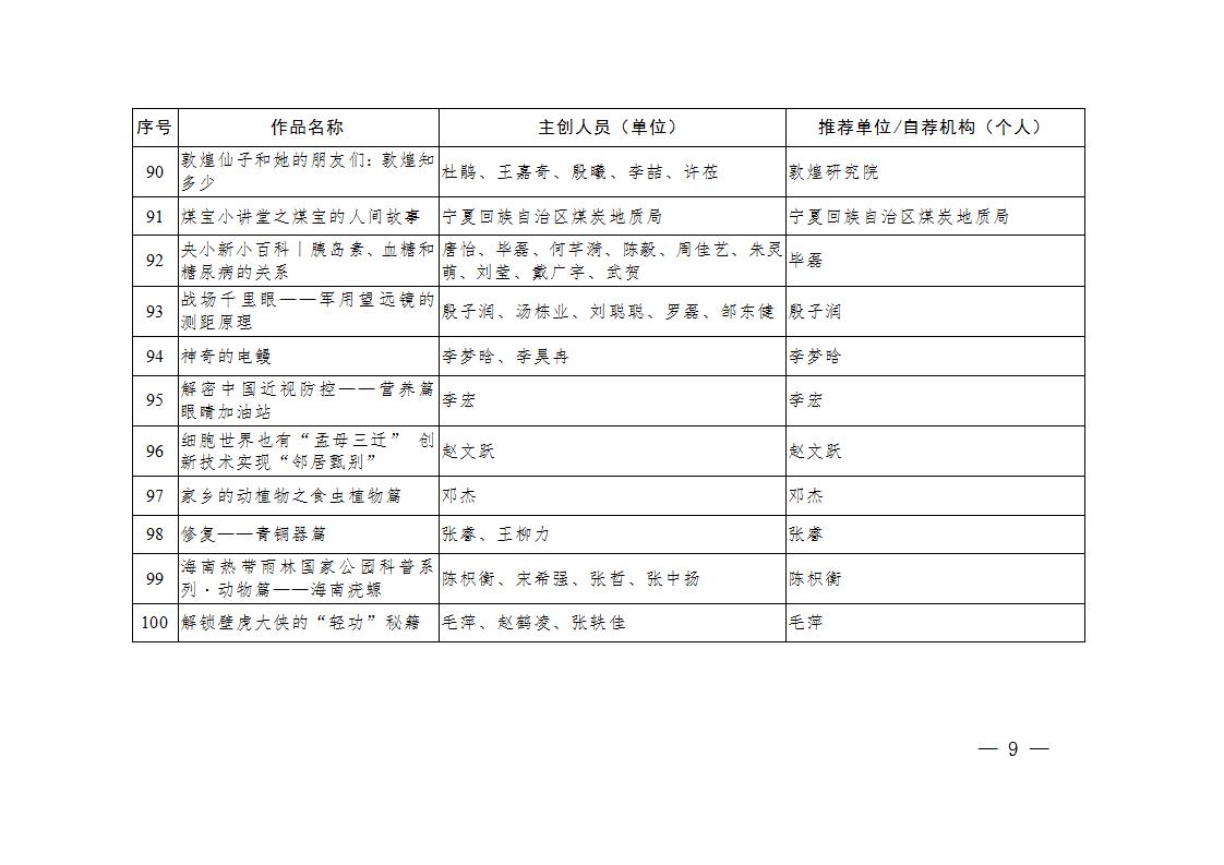 2023年度全國科普微視頻大賽活動得到了各地方各部門的積極響應,共收到各地方各部門推薦和社會機構、個人自薦的作品813部。經形式審查、專家評審和公眾評選網絡投票,評選出2023年度全國優秀科普微視頻作品100部(名單見附件),經公示無異議?,F將《mRNA疫苗從軍記》等100部作品向全社會推薦,并頒發榮譽證書。