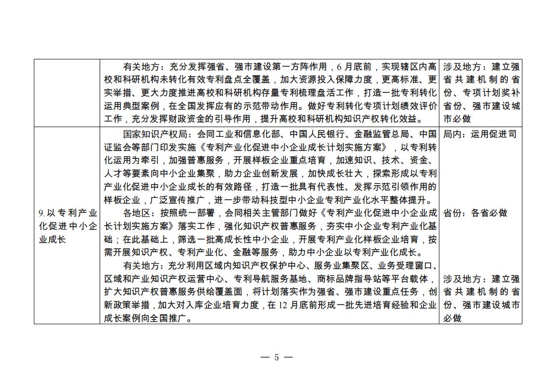 ——知識(shí)產(chǎn)權(quán)運(yùn)用。全面推進(jìn)專利轉(zhuǎn)化運(yùn)用專項(xiàng)行動(dòng),力爭年底前實(shí)現(xiàn)全國高校和科研機(jī)構(gòu)未轉(zhuǎn)化有效專利盤點(diǎn)全覆蓋,一批高價(jià)值專利實(shí)現(xiàn)快速轉(zhuǎn)化,知識(shí)產(chǎn)權(quán)質(zhì)押融資規(guī)模和惠及中小企業(yè)數(shù)量增長10%以上,全國專利密集型產(chǎn)業(yè)增加值占國內(nèi)生產(chǎn)總值比重穩(wěn)步提高。