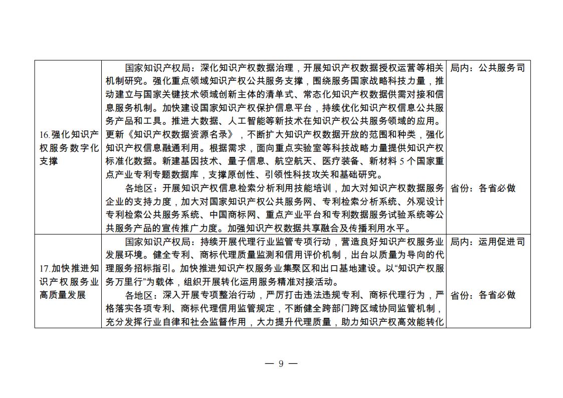 (八)提升知識(shí)產(chǎn)權(quán)公共服務(wù)效能。印發(fā)進(jìn)一步優(yōu)化知識(shí)產(chǎn)權(quán)領(lǐng)域營商環(huán)境的政策文件。深入實(shí)施知識(shí)產(chǎn)權(quán)公共服務(wù)普惠工程,加強(qiáng)公共服務(wù)機(jī)構(gòu)分類指導(dǎo),開展第二批知識(shí)產(chǎn)權(quán)公共服務(wù)標(biāo)準(zhǔn)化城市試點(diǎn)。在強(qiáng)化知識(shí)產(chǎn)權(quán)保護(hù)、示范區(qū)建設(shè)、推動(dòng)專利轉(zhuǎn)移轉(zhuǎn)化、推動(dòng)產(chǎn)業(yè)發(fā)展強(qiáng)鏈增效等知識(shí)產(chǎn)權(quán)工作全鏈條方面發(fā)揮服務(wù)支撐作用。強(qiáng)化重點(diǎn)領(lǐng)域知識(shí)產(chǎn)權(quán)公共服務(wù)支撐,圍繞服務(wù)國家戰(zhàn)略科技力量,推動(dòng)建立與國家關(guān)鍵技術(shù)領(lǐng)域創(chuàng)新主體的清單式、常態(tài)化知識(shí)產(chǎn)權(quán)數(shù)據(jù)供需對(duì)接和信息服務(wù)機(jī)制。加快建設(shè)國家知識(shí)產(chǎn)權(quán)保護(hù)信息平臺(tái),健全知識(shí)產(chǎn)權(quán)數(shù)據(jù)資源名錄,持續(xù)優(yōu)化知識(shí)產(chǎn)權(quán)信息公共服務(wù)產(chǎn)品和工具。新建基因技術(shù)、量子信息、航空航天、醫(yī)療裝備、新材料等5個(gè)國家重點(diǎn)產(chǎn)業(yè)專利專題數(shù)據(jù)庫,支撐原創(chuàng)性、引領(lǐng)性科技攻關(guān)和基礎(chǔ)研究。(公共服務(wù)司負(fù)責(zé))出臺(tái)以質(zhì)量為導(dǎo)向的代理服務(wù)招標(biāo)指引,深入開展轉(zhuǎn)化運(yùn)用服務(wù)精準(zhǔn)對(duì)接活動(dòng),加快推進(jìn)知識(shí)產(chǎn)權(quán)服務(wù)業(yè)集聚區(qū)和出口基地建設(shè)。持續(xù)開展專項(xiàng)行動(dòng),健全專利商標(biāo)代理質(zhì)量監(jiān)測(cè)和信用評(píng)價(jià)機(jī)制。(運(yùn)用促進(jìn)司負(fù)責(zé))