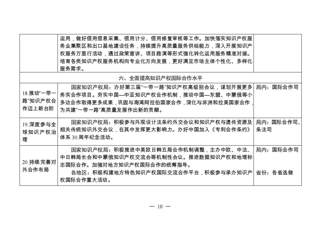 (九)統(tǒng)籌知識(shí)產(chǎn)權(quán)國際合作與競(jìng)爭。辦好第三屆“一帶一路”知識(shí)產(chǎn)權(quán)高級(jí)別會(huì)議、中國加入《專利合作條約》體系30周年紀(jì)念活動(dòng),推動(dòng)知識(shí)產(chǎn)權(quán)國際合作邁上新臺(tái)階。持續(xù)完善對(duì)外合作布局,深化與其他國家知識(shí)產(chǎn)權(quán)機(jī)構(gòu)合作伙伴關(guān)系,深度參與中美歐日韓知識(shí)產(chǎn)權(quán)五局合作項(xiàng)目梳理,在合作機(jī)制調(diào)整中發(fā)揮積極作用,推動(dòng)完善擴(kuò)容后的金磚國家知識(shí)產(chǎn)權(quán)合作。持續(xù)加強(qiáng)中歐、中美、中日韓、中國—東盟、中國—中亞、中蒙俄、中非、中拉等國家和地區(qū)多雙邊合作交流。鞏固和拓展專利審查高速路合作網(wǎng)絡(luò)。(國際合作司負(fù)責(zé))積極參與外觀設(shè)計(jì)法條約、知識(shí)產(chǎn)權(quán)與遺傳資源及相關(guān)傳統(tǒng)知識(shí)外交會(huì)議磋商,廣泛參與多邊規(guī)則制定和完善。(國際合作司、條法司等按職責(zé)分工負(fù)責(zé))