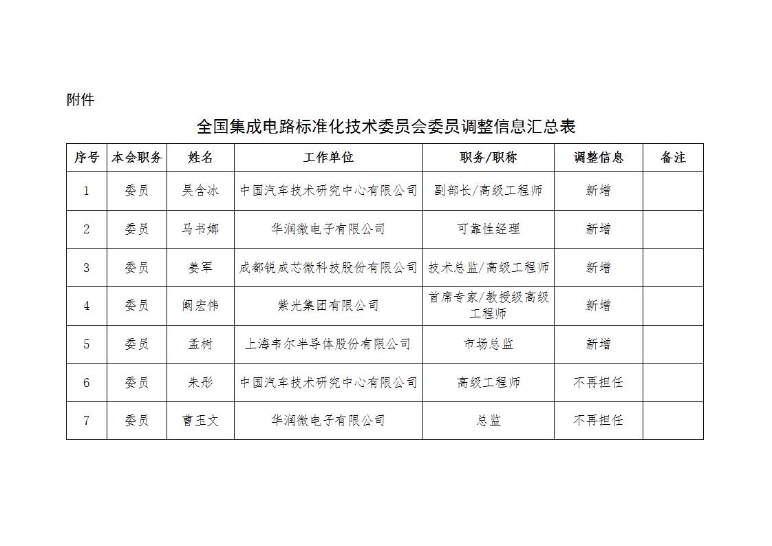 附件:全國集成電路標準化技術(shù)委員會委員調(diào)整信息匯總表