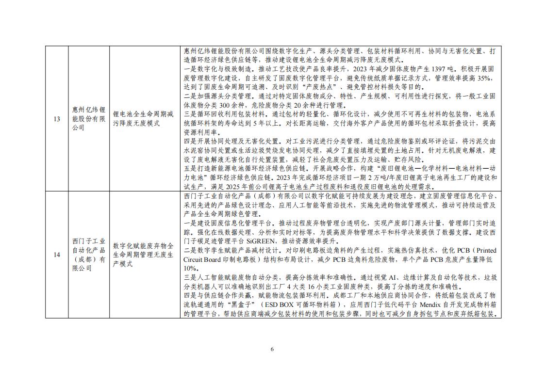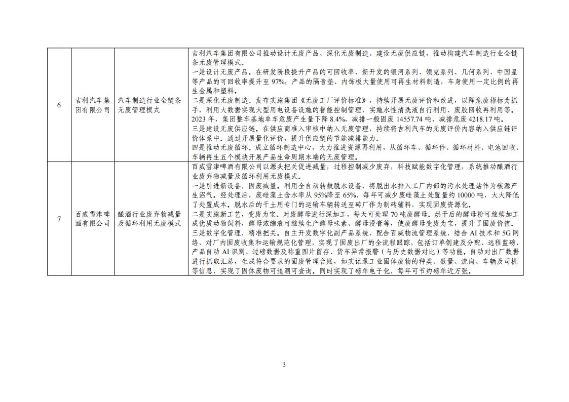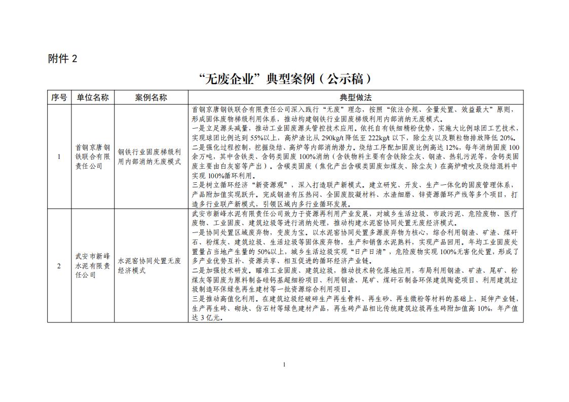 ? ? ?“無廢”是一種先進的管理理念,旨在最終實現固體廢物產生量最小、資源化利用充分、處置安全的目標。為落實《“十四五”工業綠色發展規劃》《“十四五”時期“無廢城市”建設工作方案》,引導工業園區、工業企業推行無廢生產方式,提高資源利用效率,實現工業固廢源頭減量和就地就近資源化利用,工業和信息化部、生態環境部按照固廢綜合利用水平高、管理機制健全、創新性強、可復制、易推廣的原則,征集了一批“無廢園區”“無廢企業”典型案例,現予以公示。如有意見或建議,請于2024年9月17日前反饋工業和信息化部節能與綜合利用司。