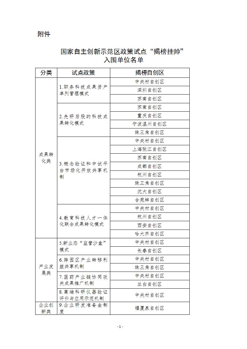 兩部門關于公布國家自主創新示范區2024年政策試點“揭榜掛帥”入圍單位名單的通知